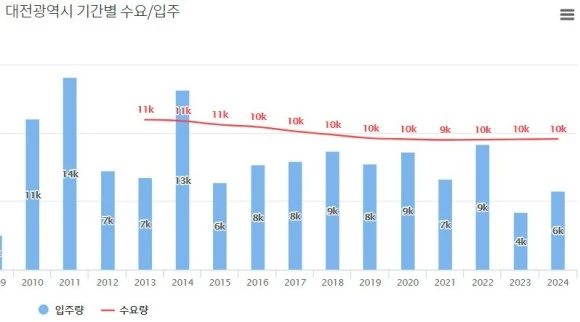 앞서 살펴본 주택수 비율뿐만 아니라 부동산 지인에서 분석한 수요량과 입주량 그래프도 분석해보자. 아래 자료처럼 대전은 꾸준하게 수요량이 공급량보다 많다. 2020년 12월 대비 2021년 6월까지의 집값 상승률도 9.3%로 높다.