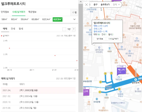 2018년부터 2021년까지 주변 아파트의 시세가 몇 억씩 오른 것에 비하면 아래 자료와 같이 서울 한복판에 있는 아파텔이라고 해도 시세의 큰 변동이 없는 아파텔이 많다.