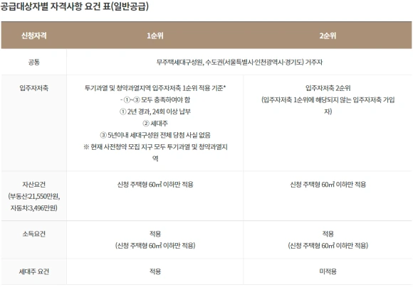 통장 가입 기간은 2년 경과, 24회 이상 납부해야 하며 5년 이내 세대 구성원 전체가 당첨된 사실이 없어야 한다. 60㎡ 이하 신청 시 자동차는 3,496만 원을 넘으면 안 된다.