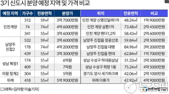 아래 가격 비교표를 보면 좌측의 3기 신도시 분양가가 우측의 기존 단지 시세보다 확실히 높은 경향이 있다.