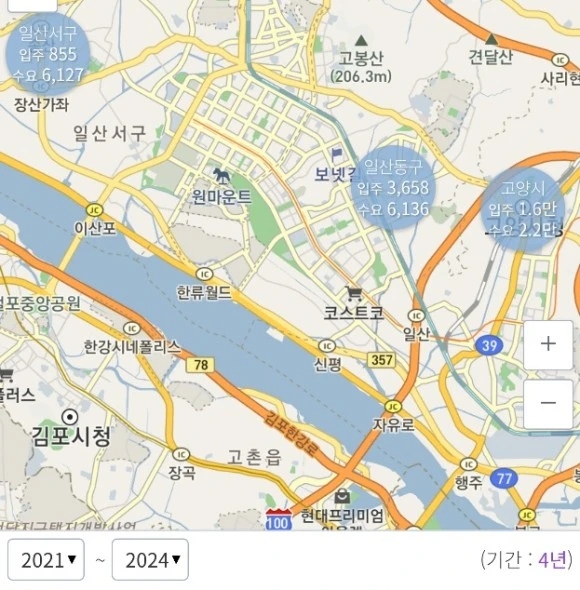 한 일산의 수요량과 공급량을 나타내는 지표이다. 일산 서구에서 입주 예정 물량은 855인 반면 수요는 6,127이나 된다.