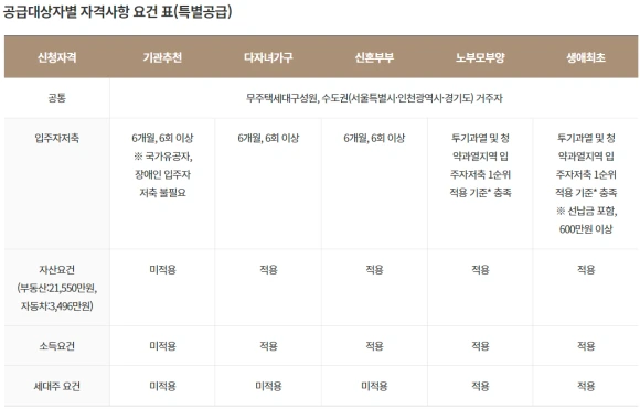 특별 공급은 신혼부부, 다자녀 가구, 생애 최초, 노부모 부양, 기관추천으로 나뉜다. 공통자격으로는 무주택세대구성원이면서 서울시, 인천시, 경기도 거주자여야 한다.