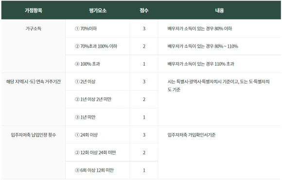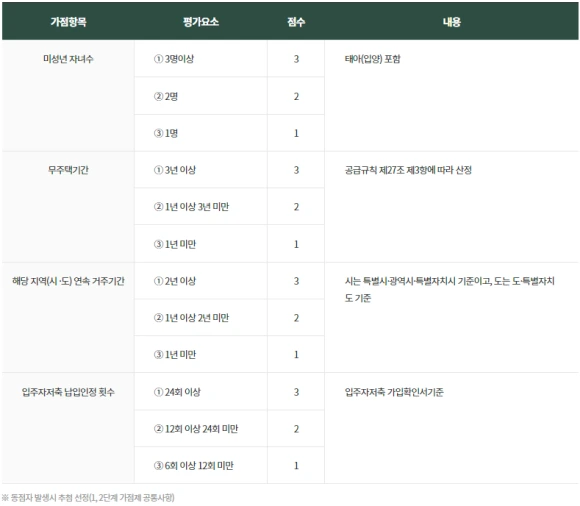 미성년 자녀수가 5명 이상이면 40점, 3세대 이상이거나 한부모가족이면 5점, 무주택기간 10년 이상이 20점, 해당 지역 거주 기간이 10년 이사이면 15점, 저축 가입 기간이 10년 이상이면 5점으로 각각 가장 높은 배점을 준다.