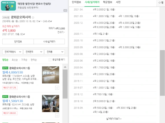 아래는 서울 3대 도심 업무지구 중 하나인 사대문 안에 있는 한 아파텔의 시세이다.