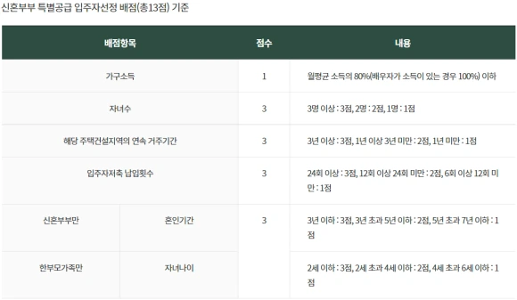 신혼부부 특별공급 외에 신혼희망타운이 있다. 혼인 2년 이내이고 2세 이하 자녀가 있는 경우가 유리하다. 자녀수 3명 이상이면 3점, 무주택 기간도 3년 이상일 경우 3점으로 높은 가점을 받는다.
