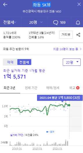 위 자료는 2021년 8월 기준, 부산시 해운대구 좌동에 있는 SK뷰 단지의 실거래가 시세 그래프다. 매매가와 전세가가 1억 원 정도 차이를 보인다.