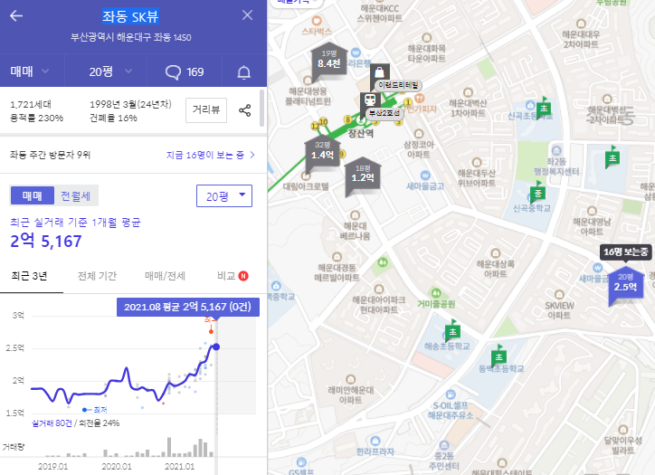 부산시 해운대구 좌동 SK뷰 시세 (출처 : 호갱노노)