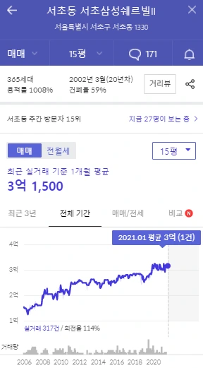 아래는 강남 역세권에 위치한 "서초 삼성쉐르빌 Ⅱ" 주상복합의 원룸형 타입 시세 그래프다.