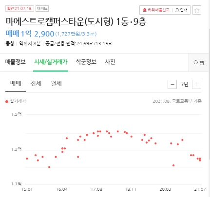 전용 면적 13.15㎡인 원룸 형태의 아파트이다 보니 역세권이라고 해도 2012년 준공 후 2021년까지 가격 상승이 거의 없는 것을 확인할 수 있다.