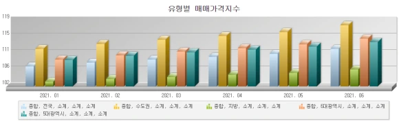 2021년 상반기까지 전국의 매매가격지수는 지속적으로 상승하고 있다. 매매가격지수란 한국부동산원에서 특정 일을 100으로 기준을 잡고 이후 상승 또는 하락 정도를 측정한 값이다.