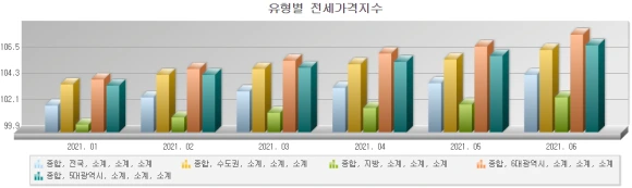 매매가격지수 못지않게 전세가격지수도 상승하고 있다. 아래는 2021년 1월부터 6월까지 전세가격지수다.