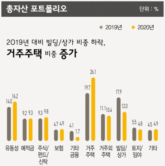 KB 경영연구소의 2020년 부자 보고서를 살펴보자. 부자들의 자산 중 똘똘한 한 채의 자산 비중이 26.1% 일 정도로 큰 비중을 차지하고 있다.