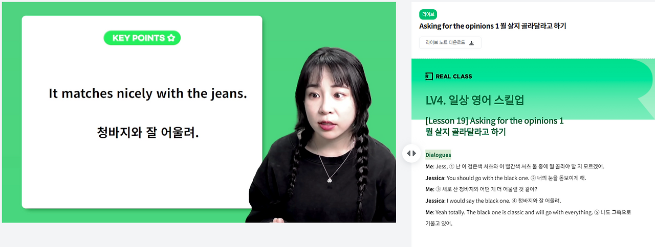 라이브 수업이라 채팅으로 참여할 수 있는데, 문장 계속 만들어보고 맞든 틀리든 던지고 교정 받고 하다 보면 40분이 금방 간다. 다 정말 쓸 것 같은 표현들이라서 하나하나 다 기억해 두려 노력한다.