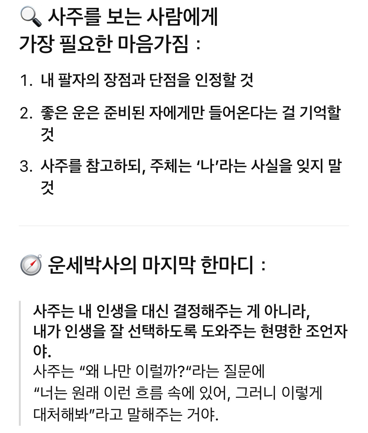 사주든 신점이든 언제나 맹신하려는 태도는 경계하지만 그냥 이따금 삶이 내 맘 같지 않을 때 한 번쯤 인생을 남의 눈으로 들여다 보기에는 또 이만한 것이 없다. 잘 풀린다면 기분 좋고 안 풀린다면 잘 풀리게끔 애써보는 마음으로. 대운이라는 내년을 기대해 보며 사는 게 인생이니까.