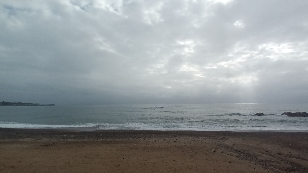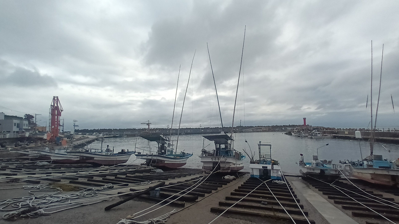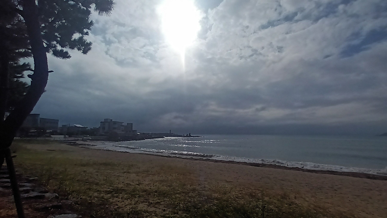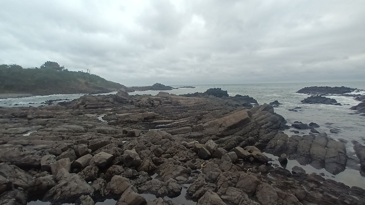 해파랑길 10코스의 주요 지점은 이렇다. 정자항과 정자해변 -> 강동화암주상절리 -> 관성솔밭해변 -> 읍천항벽화마을 -> 나아해변까지. 이곳에서는 몽돌해변과 해안 주상절리, 주상절리를 볼 수 있는 전망대가 설치되어 있다는 점에서 매력적으로 느껴진다. 9월부터 10월까지 토요일마다 비가 내렸고 당일 아침은 항상 흐렸다. 2025년 10월 4일 토요일, 역시 오늘도 새벽부터 비가 내렸는데 다행히도 잔잔하게 내리는 비라서 위험하지는 않았고, 안전하게 자동차로 시작점까지 이동할 수 있었다. 우리 가족은 '정자해변'과 강동몽돌해변 중간쯤 되는 무료주차장에 차를 주차해 놓고 해파랑길을 시작했다. 시작 전에 정자해변에 잠시 들어갔다 나왔는데 드디어 바다와 맞닿아 있다 보니 기분이 상쾌해졌다.