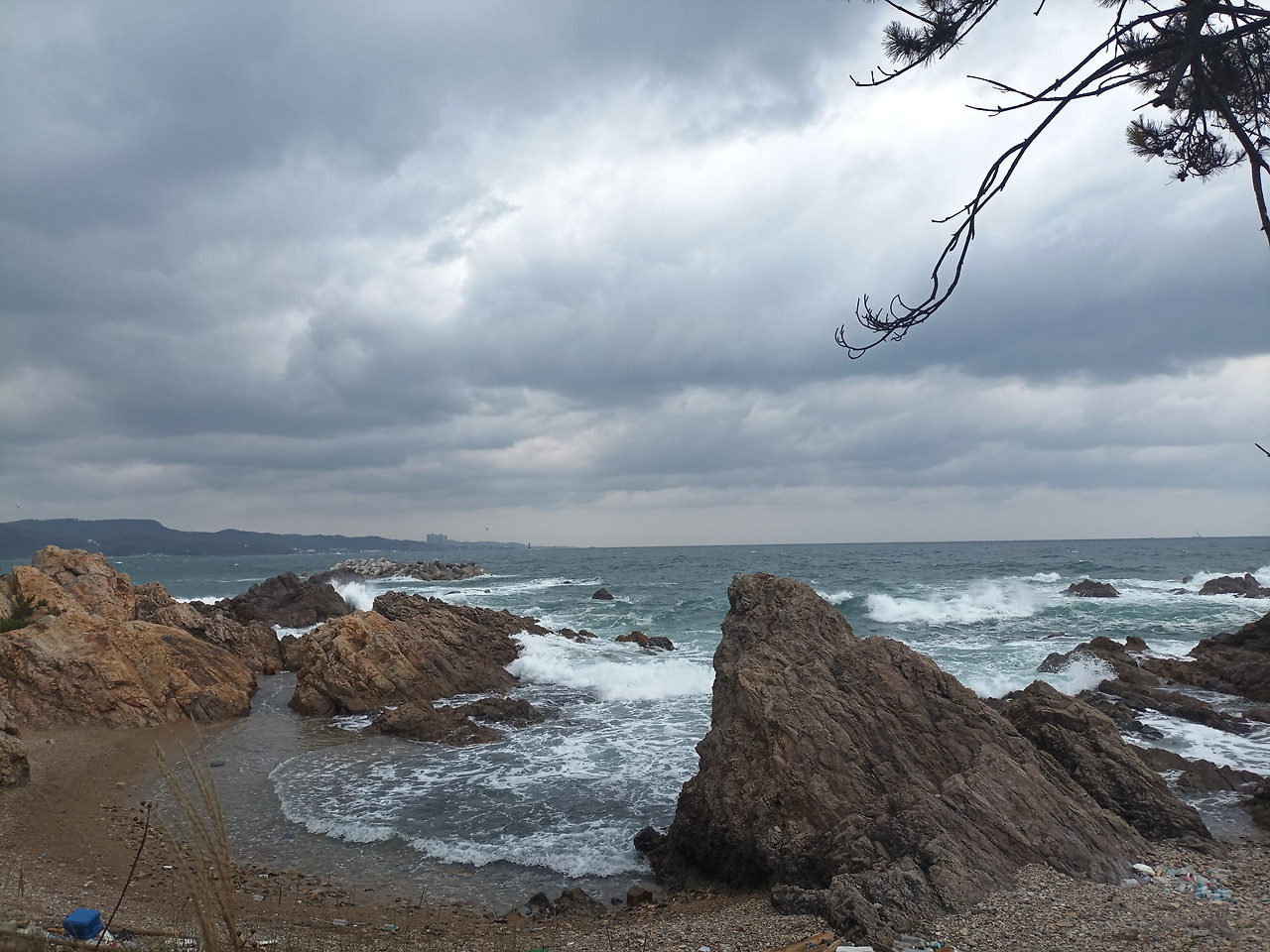 분명히 '비가 오지 않고 흐림'이라는 기상예보 및 날씨를 몇 번이고 확인체크를 해둔 상태였다. 흐린 날에는 우산을 챙기기도 하지만 비가 오지 않을 것 같으면 굳이 챙길 필요도 없어서 그날은 우산도 챙기지 않았다. 그날은 참 이상했다. 준비물을 챙기기가 싫었다. 그것이 '화'가 되었나. 바닷가 쪽으로 걸으면 걸을수록 비가 조금씩 내리기 시작하더니 나중에는 바람이 불면서 더 세차게 비가 몰아치기 시작했다. 엄마께서 마침 우산은 아니고 '양산'이 있어서 그것으로 비를 막아보고자 양산을 펼쳤으나 얄미운 바닷바람이 양산을 몇 번이나 뒤집히도록 공격했다. '계속되는 우중충한 날씨에 비가 세차게 오는 것은 이젠 지쳐.'는 말이 연신 튀어나왔다. 비는 왜 자꾸 내리는 것인가. 내가 해파랑길을 걷기만 하면.
