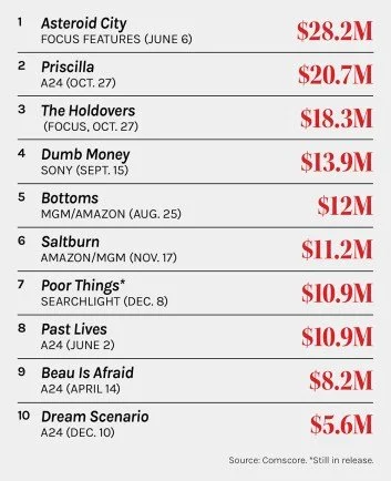 A24의 작품들을 비롯한 여러 저예산 독립 영화 역시 스트리밍 서비스와 극장 개봉을 적절히 활용하여 보다 폭 넓은 관객들에게 어필에 성공, 아트하우스 시네마의 전성기를 이뤘습니다. 웨스 앤더슨 감독의 <애스터로이드 시티>와 요르고스 란티모스 감독의 <푸어 띵스>, 그리고 셀린 송 감독의 <패스트 라이브즈> 등 예상 외의 좋은 성적으로 다양한 관객의 니즈를 충족시켜주었습니다.