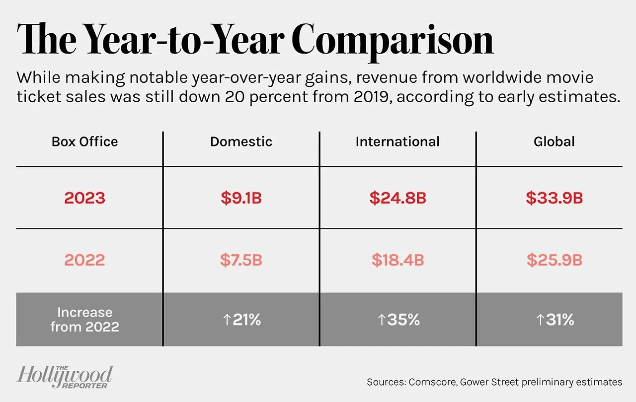 코로나 이후 정상 궤도에 들어선 첫 해인 2022년과 비교해 북미와 국제 영화 시장이 훨씬 더 활기를 띤 것을 볼 수 있습니다. 총파업의 여파로 2024년 개봉작들의 무게감이 살짝 떨어지는 편인데, 과연 이에 따라 극장을 찾는 발걸음도 줄게 될지, 아니면 바비나 슈퍼 마리오처럼 의외의 10억불 흥행작이 혜성처럼 등장할지 귀추가 주목됩니다.