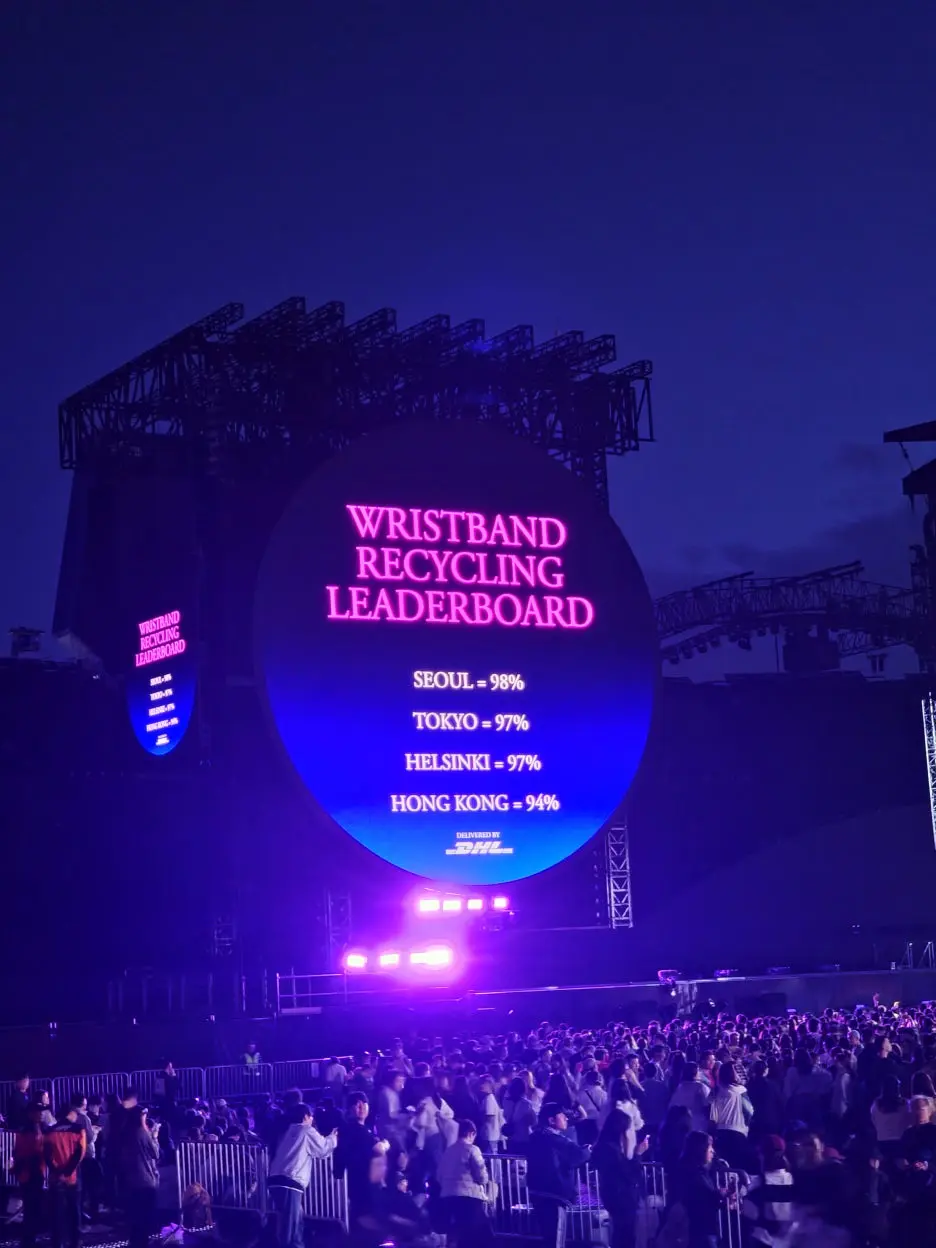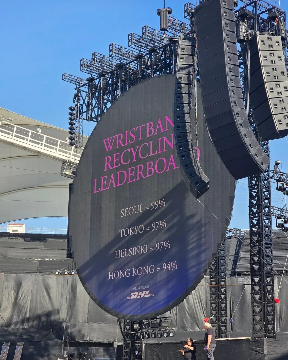 그리고 이번에 화제가 되었던 자이로밴드(Xylobands)는 100% 퇴비화 가능한 소재로 만들어 공연 때마다 재사용을 했죠. 그리고 그 반납률을 각 투어마다 기록해 국가별로 순위를 매겨 국가대항전이 펼쳐졌는데, 이전 기록이었던 도쿄의 97%를 한국이 99%로 이기며 또 한 번의 한일전에서 승리를 거두었습니다(펄~럭).