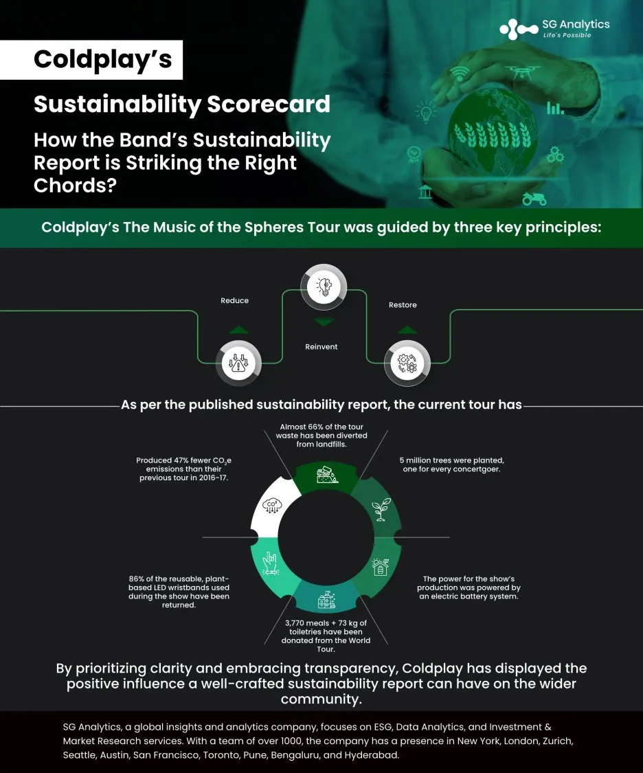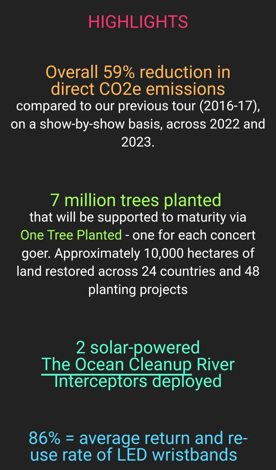 이러한 노력들을 통해 통해 투어 초기 2년 동안 탄소 배출량을 59% 감축하는 데 성공했으며, 이로 인해 타임지(Time)는 콜드플레이를 "가장 영향력 있는 기후 행동 리더" 중 하나로 선정하기도 했죠.