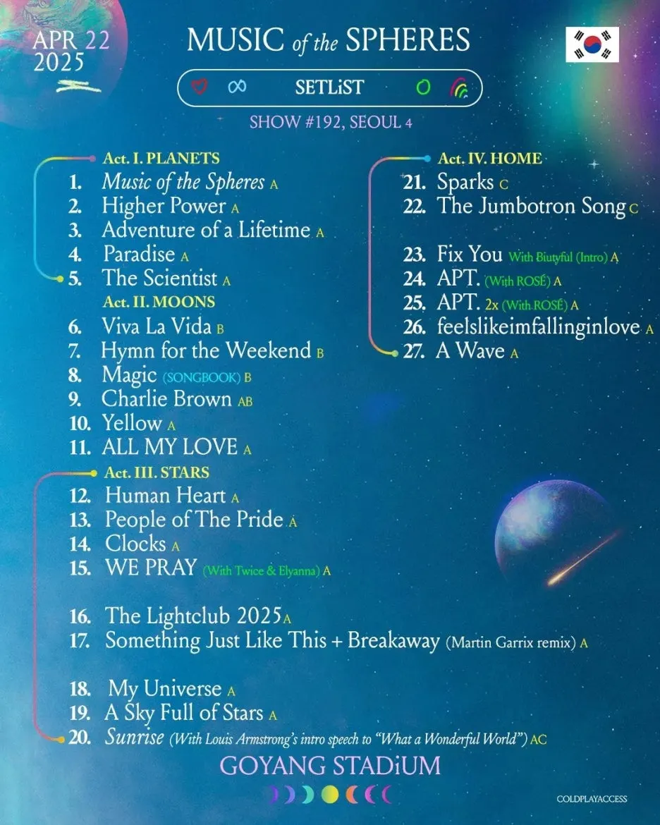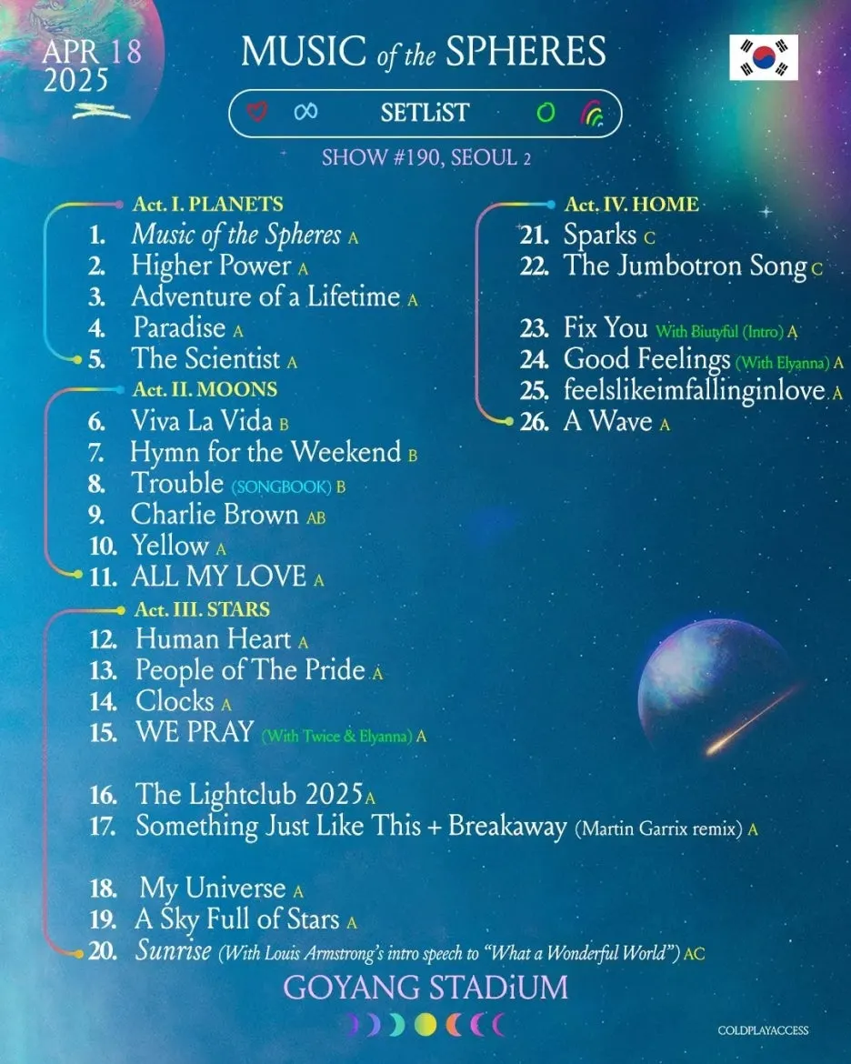 그리고 너무나도 예쁜 세트를 자랑하는 "My Universe"가 끝나면 모두의 기억 속에서 평생 살아 숨 쉴 "A Sky Full of Stars" 무대와 함께 3막도 마무리됩니다.
