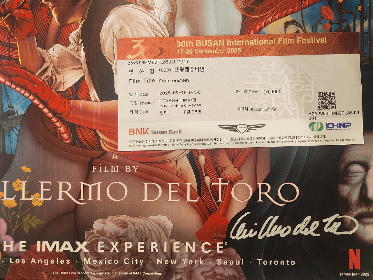 9월 19일 진행된 제30회 부산국제영화제(BIFF) 기예르모 델 토로 감독의 신작 <프랑켄슈타인> GV 상영회에 다녀왔습니다. 무려 전 세계 최초 IMAX 상영회와 더불어 30여분 간의 Q&A 세션, 여기에 감독님께서 관객 한 분 한 분 싸인과 함께 스몰토크까지 해주셨던 정말 꿈만 같았던 시간이었습니다. 과연 작품은 어땠을까요?