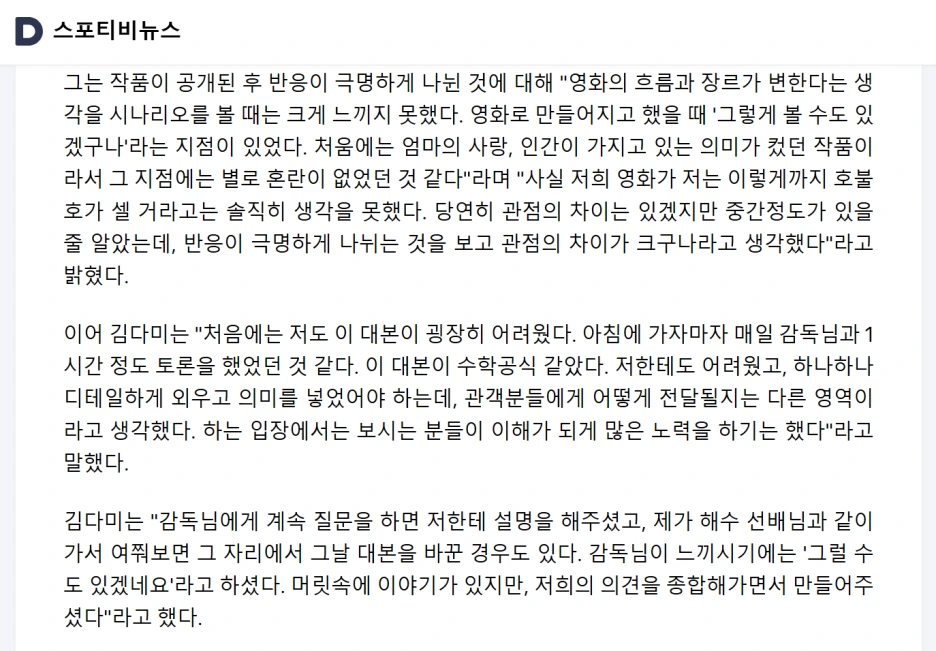 "너 뭐 돼?"라는 질문을 하실까 싶어서 대표적인 증거를 하나 가져와 봤습니다. 작품 제작 발표회때 김다미 배우가 한 인터뷰만 봐도 얼마나 작업 환경이 개판이었는지 대충 짐작이 갑니다.