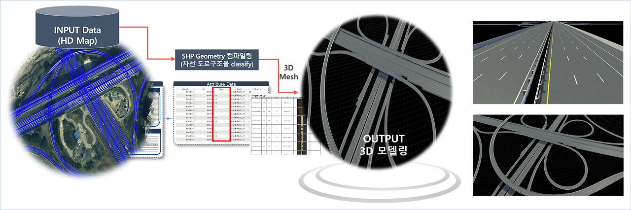 도로를 정밀하게 모델링하기 위해서는 HD Map 데이터를 활용해 위 과정을 거쳐 차로 단위의 도로 환경을 구현합니다. 특히 도로의 실제 환경을 정확하게 반영하는 것을 목표로 하며, 자동화 3D 모델링 기술을 적용하여 도로 3D 모델링 데이터를 구축합니다.