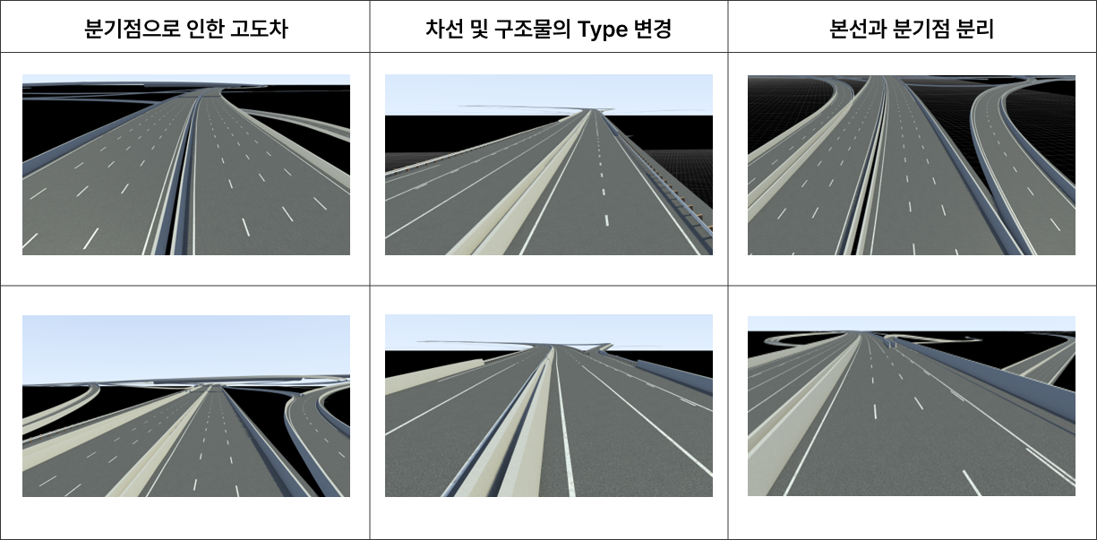HD Map의 차선 및 도로 구조물 속성을 참조해 실제 도로 환경과 일치하도록 설계하였으며, 자동화 프로세스를 통해 도로 네트워크의 복잡한 구조적 특성을 분석하고 해당 속성을 정밀하게 반영하여 보다 정확하고 세밀한 도로 모델링을 구현하였습니다.