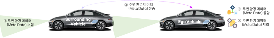 협력자율주행의 1차적인 요소는 텔레매틱스 기술입니다. 이는 차량의 위치, 속도, 센서 정보 등의 데이터를 외부와 통신으로 주고받는 기술입니다. 그리고 이를 통해 자차(Ego Vehicle)와 주변차량(Surround Vehicle)의 정보를 공유하여 인지 영역을 확장할 수 있습니다.