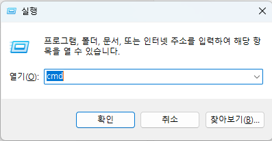 1. Win + R 키를 누른 후, 아래 이미지와 같은 창이 뜨면 cmd 입력 후 확인 버튼 클릭
