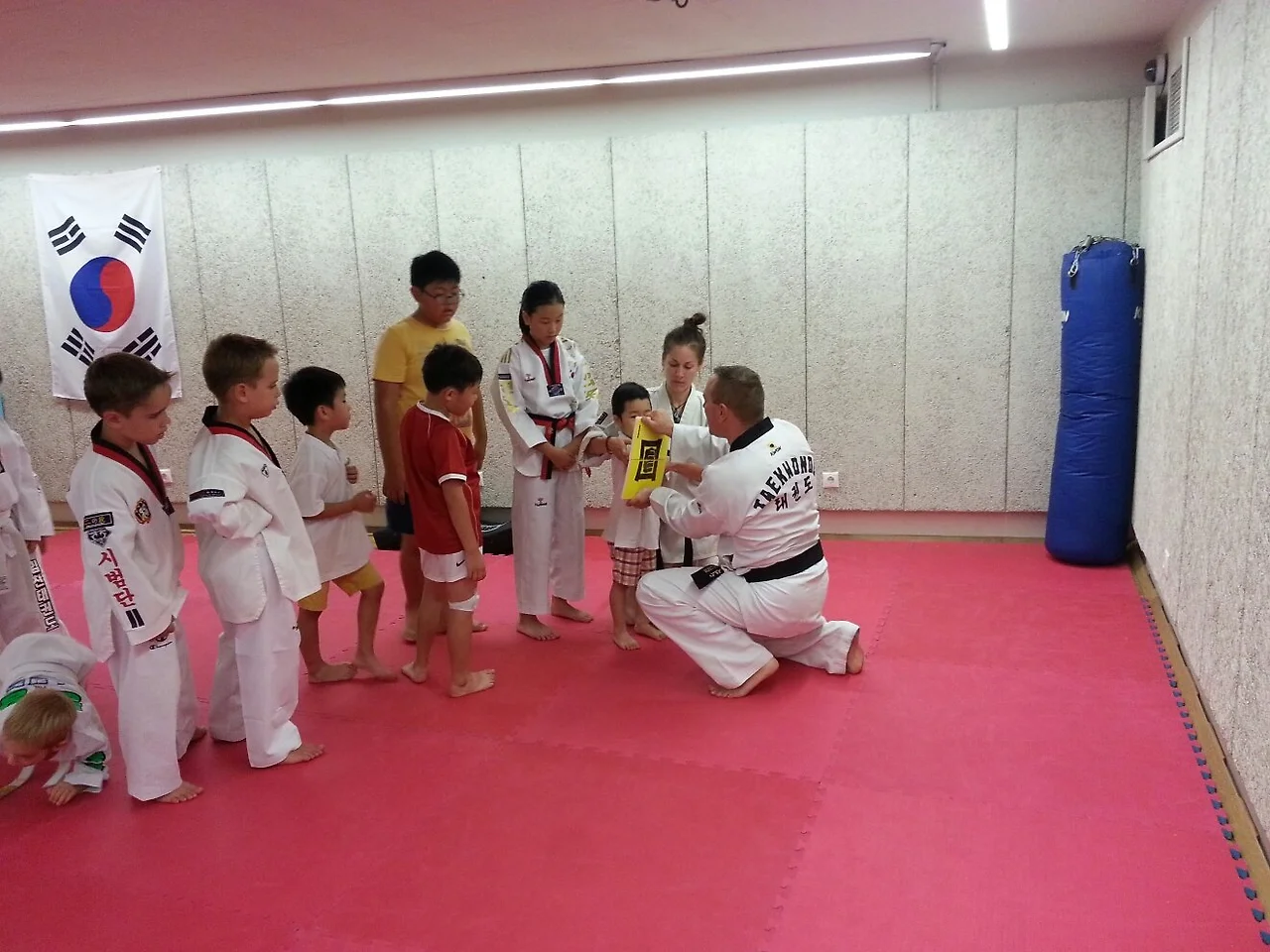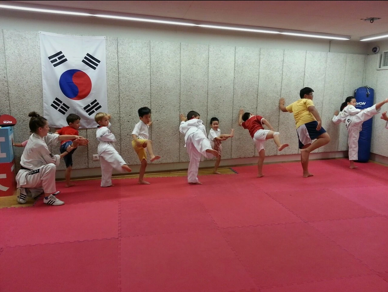 문화원 지하에 마련된 체육관엔 도복을 입은 헝가리 아이들과 풍채 좋은 헝가리 관장님, 머리를 질끈 동여맨 여자 사범님이 몸을 풀고 있었다. 한국에서 보내온 중고 도복인지 아이들이 입은 도복에는 ‘ㅇㅇ태권도’라는 태권도 도장 이름이 등에 큼지막하게 쓰여 있다. 시범단이라고 쓰인 도복을 입고 있는 아이도 있는데 실력은 초보라 귀여워 눈길이 갔다. 벽 한 편에는 태극기가 걸려있는데, 가로가 아닌 세로로 걸려있어 자꾸 신경이 쓰였다.