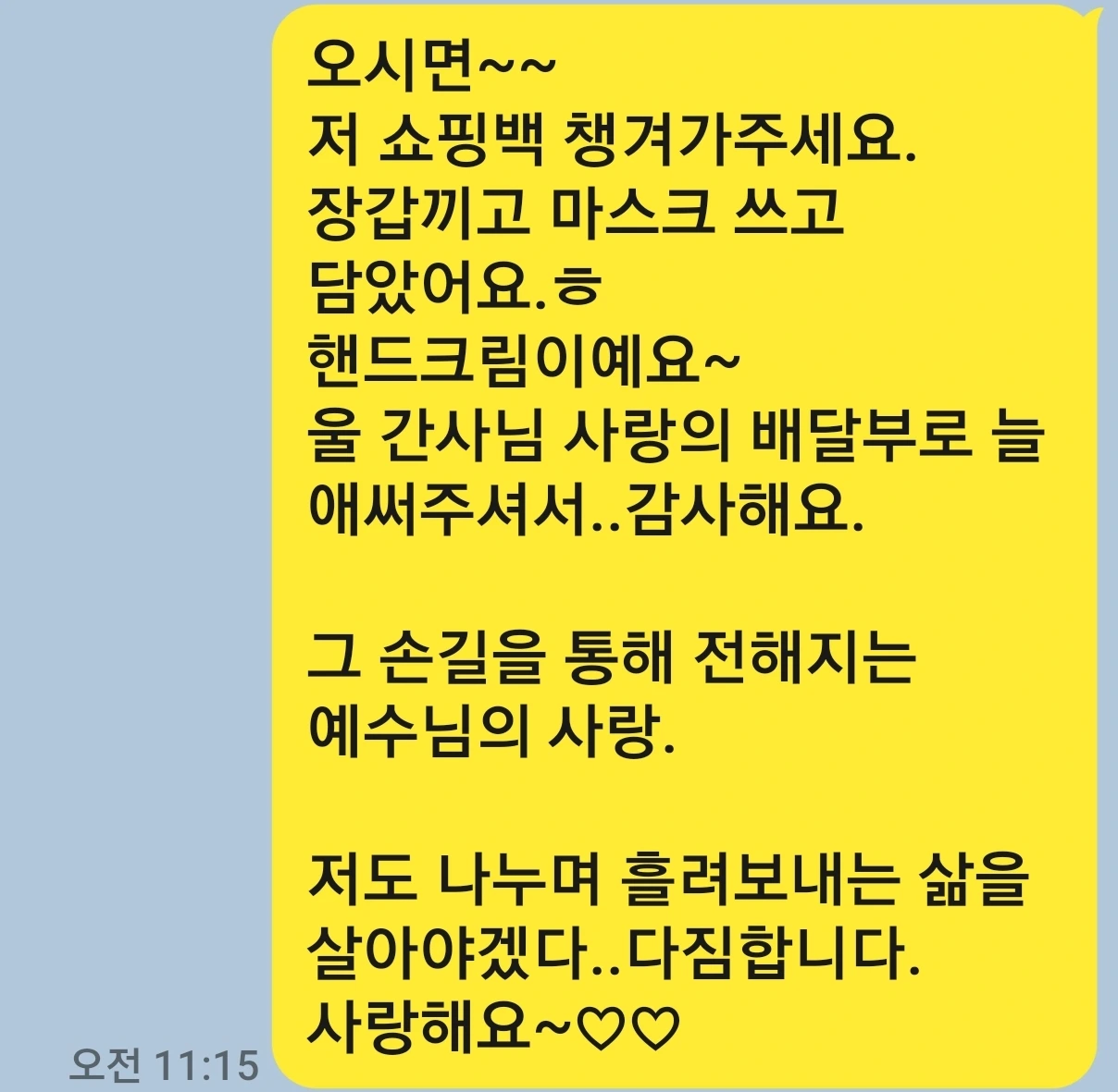 "목사님께서 확진자들 특별 보양식 준비해서 보내드리라고 하셔서요."