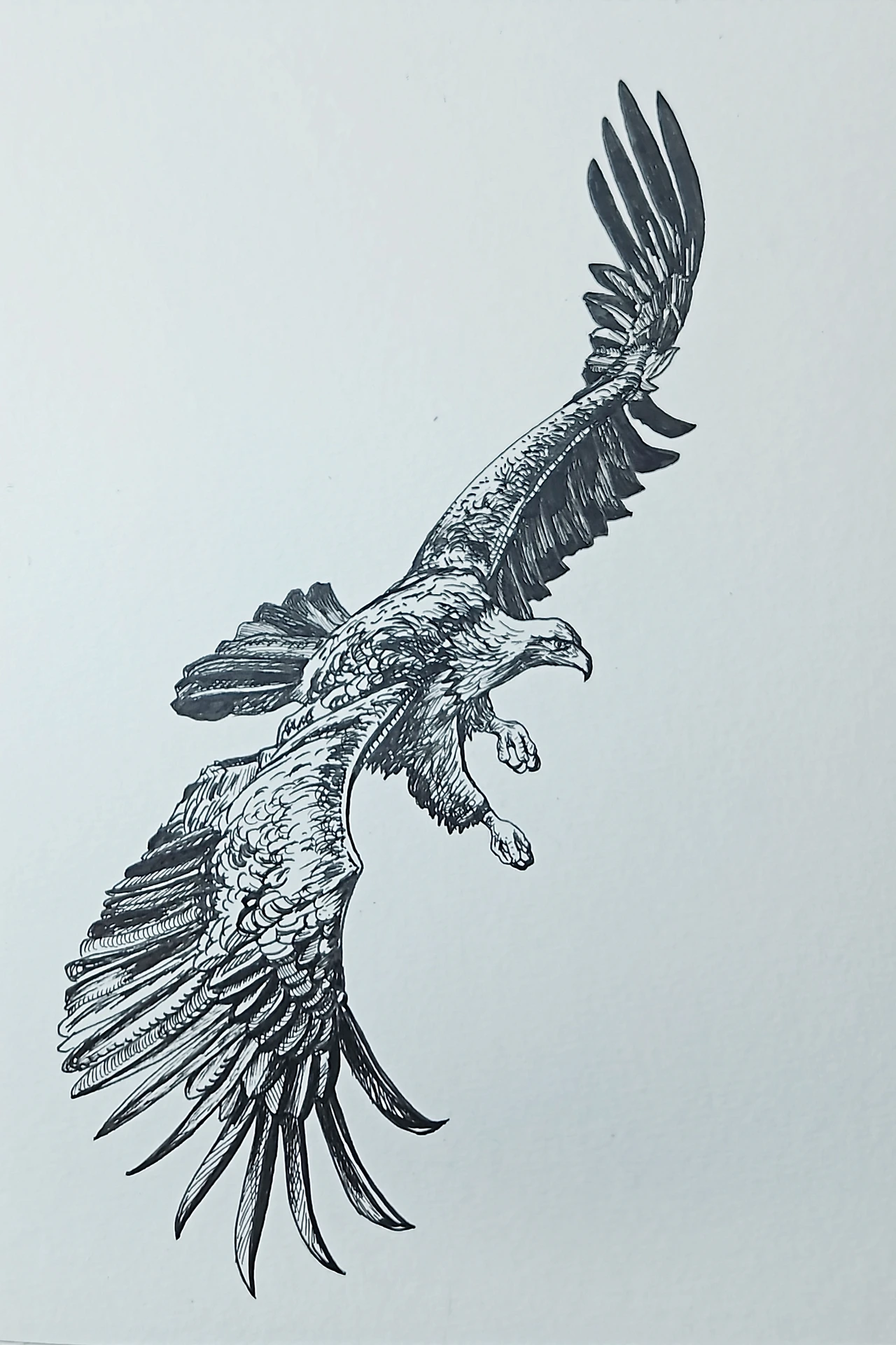 양 날개를 펼치고 나는 독수리는 자유와 힘, 그리고 높은 곳에서 전체를 바라보는 관점을 상징한다. 독수리는 높은 곳에서 세상을 조망할 수 있는 존재로, 개인의 행동이 세상의 큰 그림에 어떻게 연결되는지를 나타낸다.