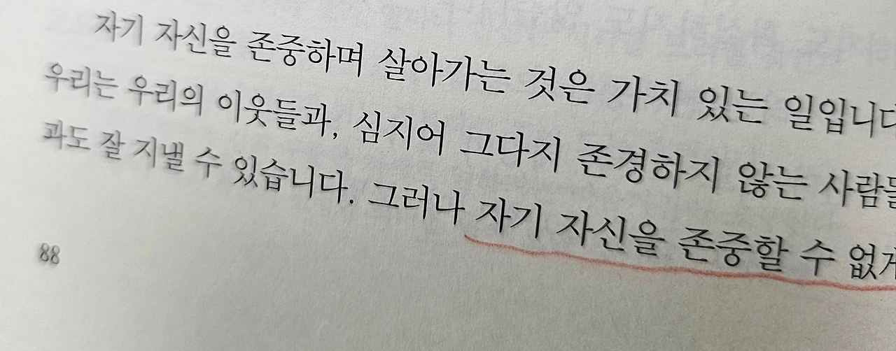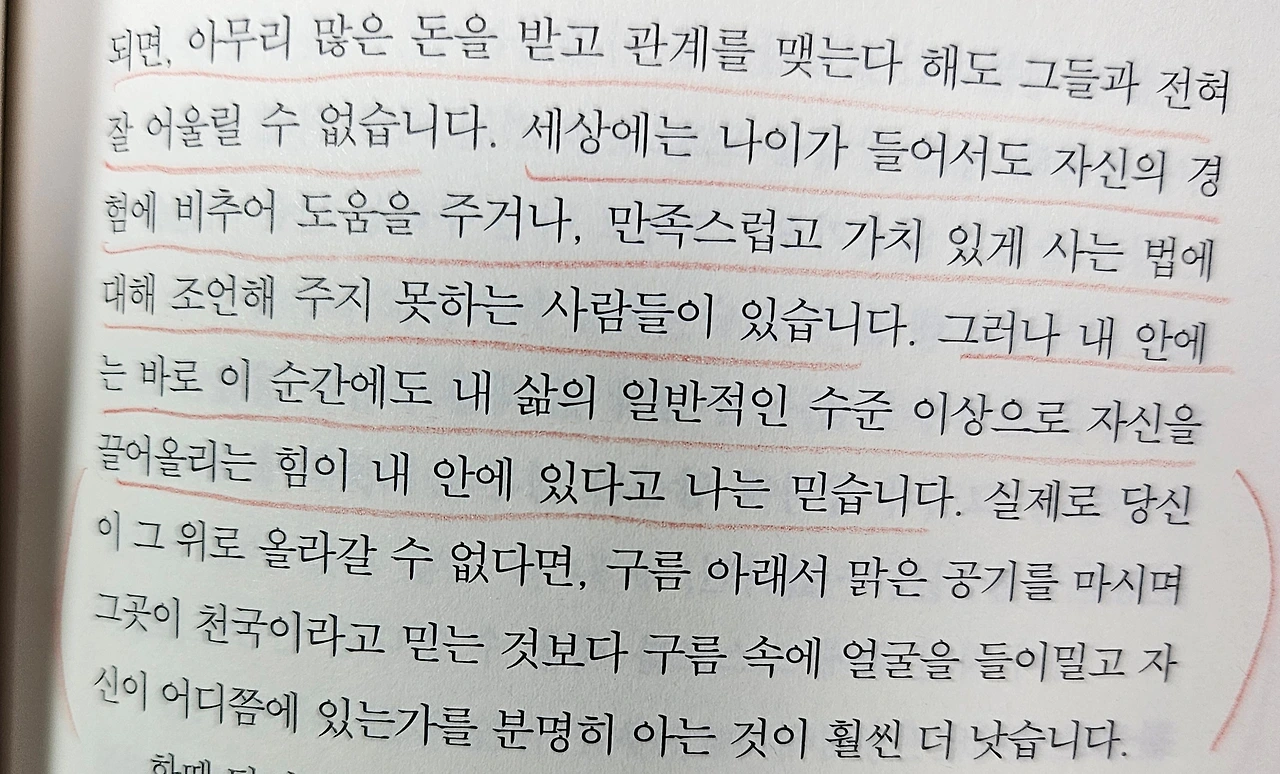 그러나 자기 자신을 존중할 수 없게 되면, 아무리 많은 돈을 받고 관계를 맺는다 해도 그들과 전혀 잘 어울릴 수 없습니다. 세상에는 나이가 들어서도 자신의 경험에 비추어 도움을 주거나, 만족스럽고 가치 있게 사는 법에 대해 조언해 주지 못하는 사람들이 있습니다. 그러나 내 안에는 바로 이 순간에도 내 삶의 일반적인 수준 이상으로 자신을 끌어올리는 힘이 있다고 나는 믿습니다.