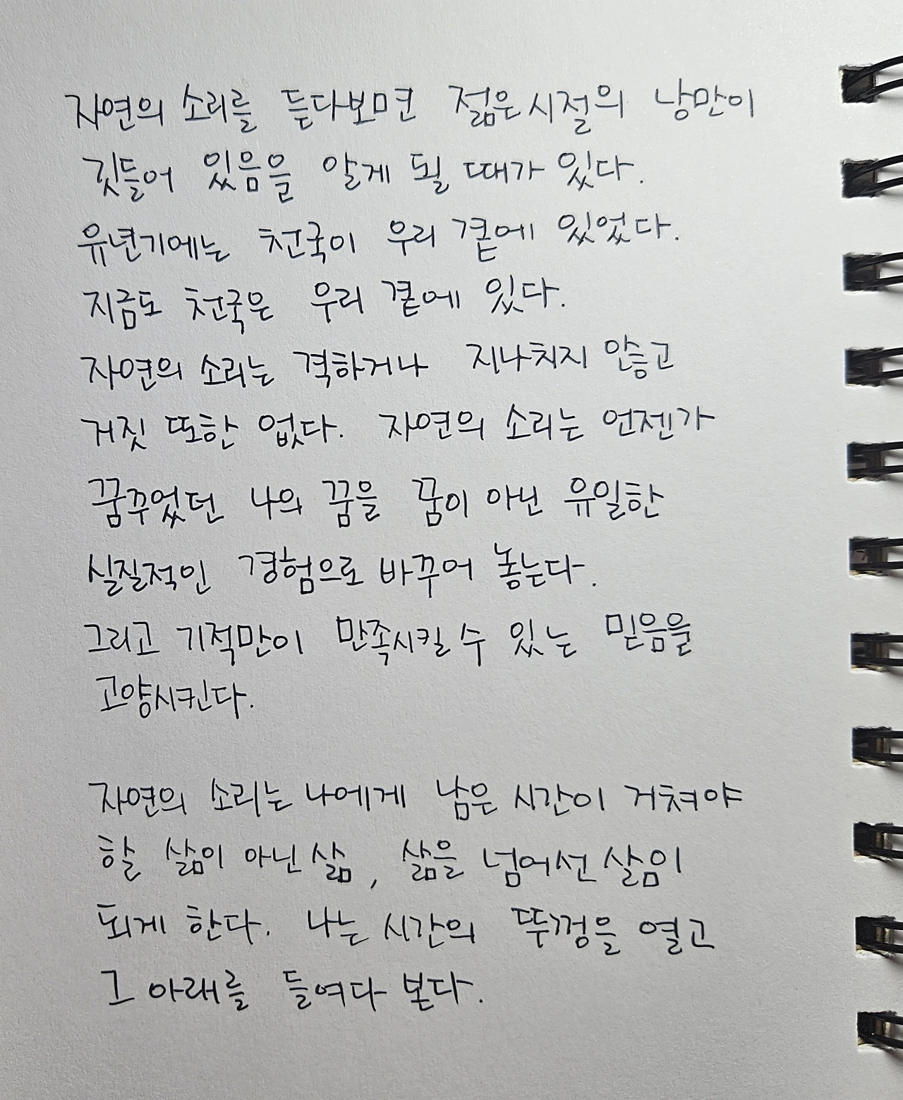 자연의 소리를 듣다 보면 젊은 시절의 낭만이 깃들어 있음을 알게 될 때가 있다. 유년기에는 천국이 우리 곁에 있었다. 지금도 천국은 우리 곁에 있다. 자연의 소리는 격하거나 지나치지 않고 거짓 또한 없다. 자연의 소리는 언젠가 꿈꾸었던 나의 꿈을 꿈이 아닌 유일한 실질적인 경험으로 바꾸어놓는다. 그리고 기적만이 만족시킬 수 있는 믿음을 고양시킨다.
