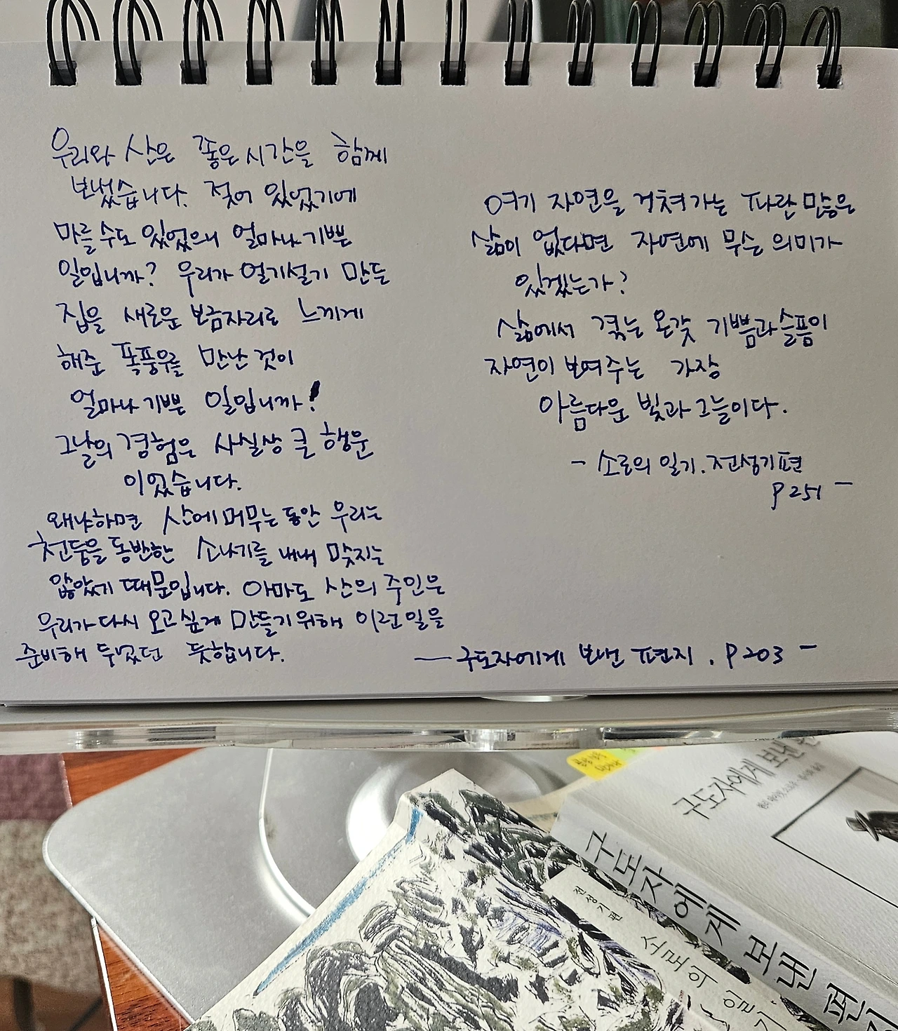 산과 좋은 시간을 보낸 사람은 한밤중에 골몰하게 될 연구과제만큼이나 달콤한 대화를 나누었을 것이다. 젖기도 하고 마르기도 한 보금자리에서 범사에 가볍고 늘 깊은 그를 본다.