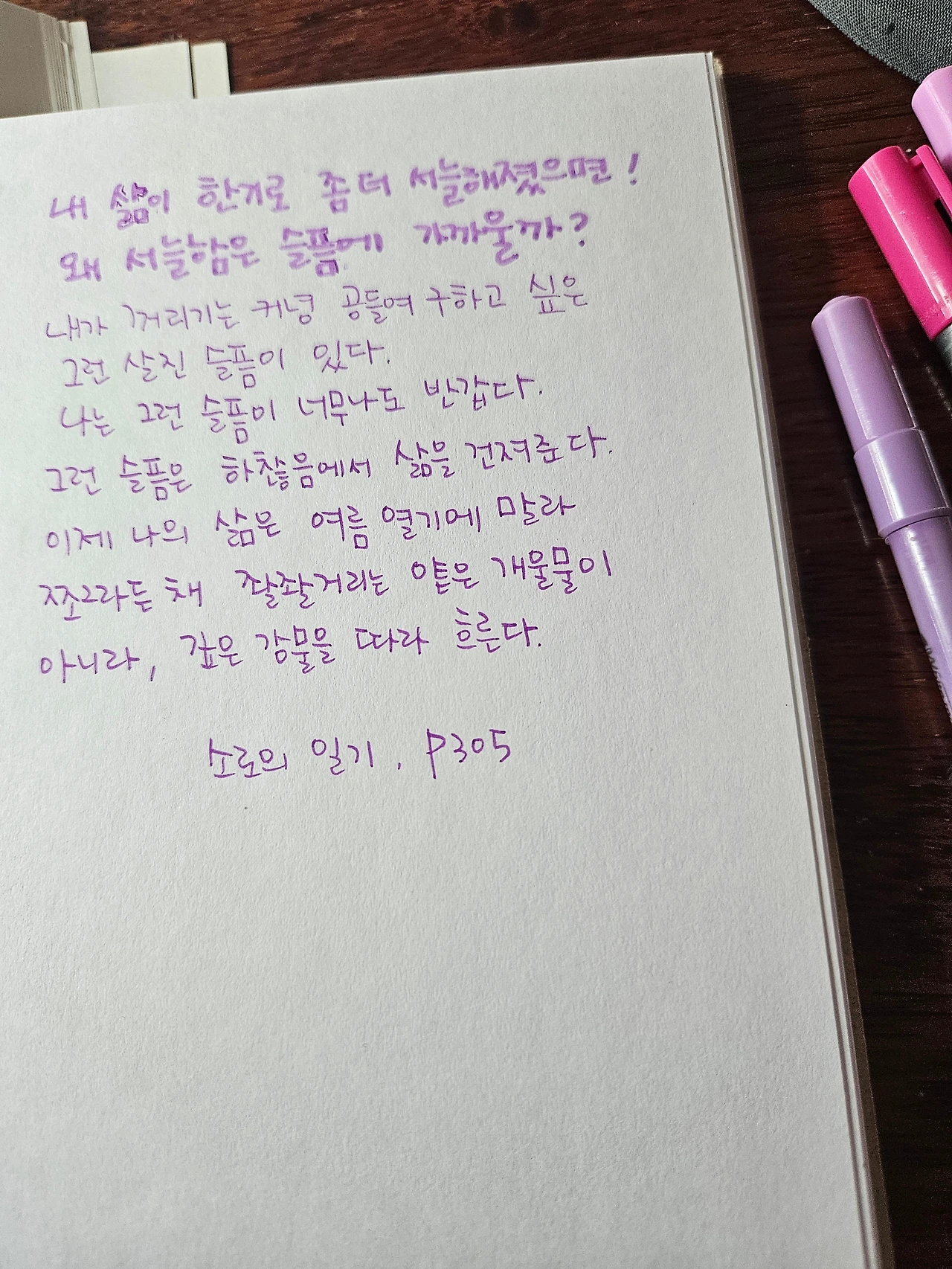 내 삶이 한기로 좀 더 서늘해졌으면! 왜 서늘함은 슬픔에 가까울까? 내가 꺼리기는커녕 공들여 구하고 싶은 그런 살진 슬픔이 있다. 나는 그런 슬픔이 너무나도 반갑다. 그런 슬픔은 하찮음에서 삶을 건져준다. 이제 나의 삶은 여름 열기에 말라 쪼그라든 채 좔좔거리는 얕은 개울물이 아니라. 깊은 강물을 따라 흐른다.
