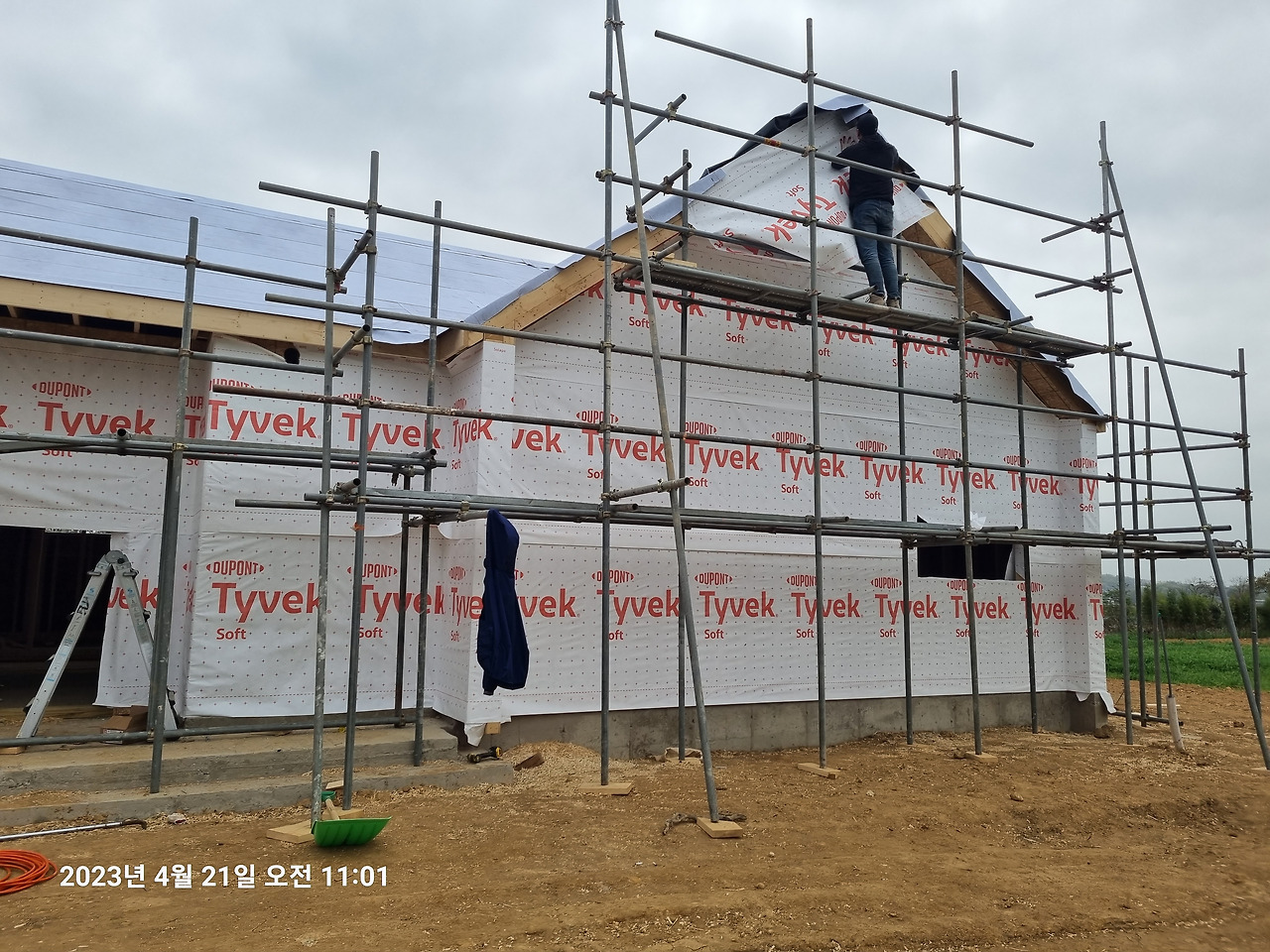 타이백이라는 사람으로 보면 집에 내복을 입히고 있다. 고어텍스옷? 이렇게 골조가 마무리된다.