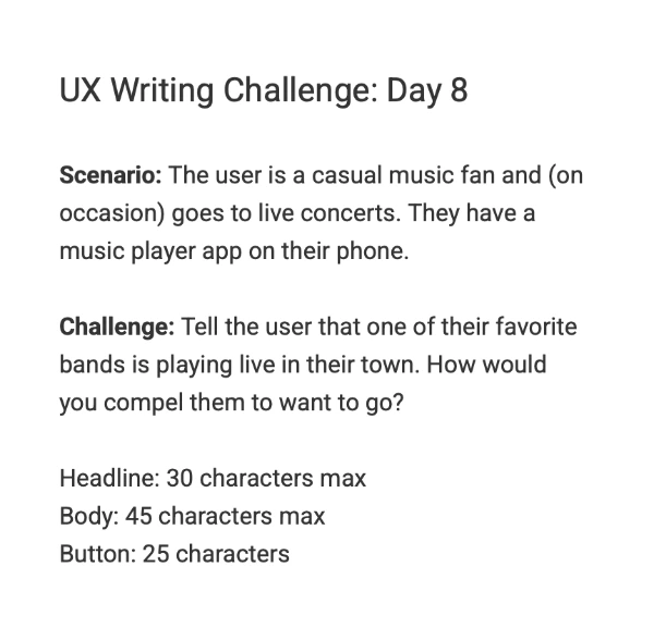 - 사용자가 좋아하는 밴드가 그의 동네에서 라이브 공연을 한다는 소식을 알리세요. 어떻게 하면 그가 공연에 가고 싶게 만들 수 있을까요?