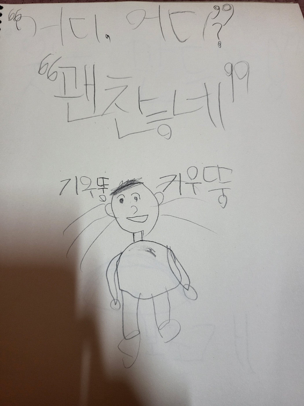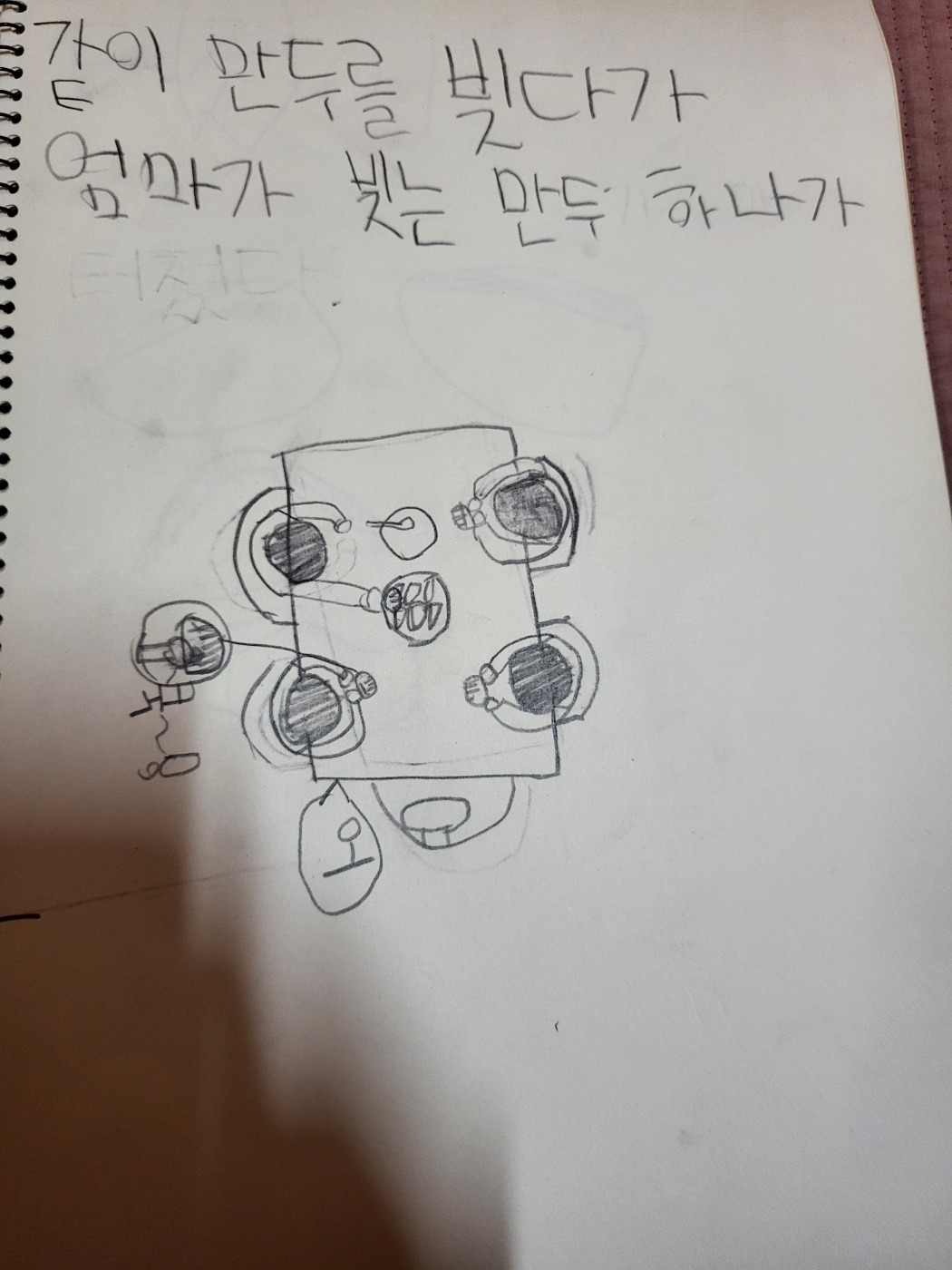 근데 문제가 하나 생겼다. 처음 문장대로 그림책 한 장에다가 두 장면을 다 담아내자니 어렵다. 크게 나누자면 식구가 모인 모습과 터진 만두, 이렇게 두 장면이다. 이 문제를 아이가 발견했다. 그래서 마지막 ‘터졌어’를 뒷장으로 넘기자고 한다. 먼저 썼던 ‘터졌어’를 지우개로 지웠다.