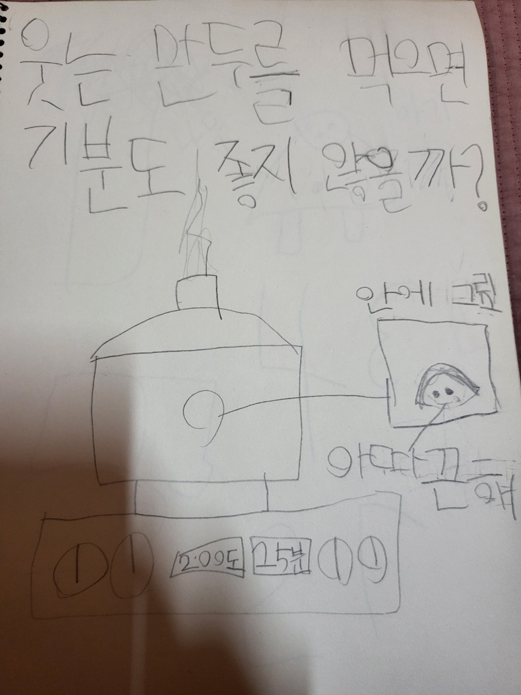 아이는 다섯 식구가 식탁 둘레에서 만두를 빚는 모습을 그리다가 자기 마음에 안 들면, 지우개로 쓱쓱 지워가면서 다시 그린다. 풍경을 위에서 내려다본 모습을 그렸다. 내 눈에는 제법 분위기가 살아나는 그림 같다.