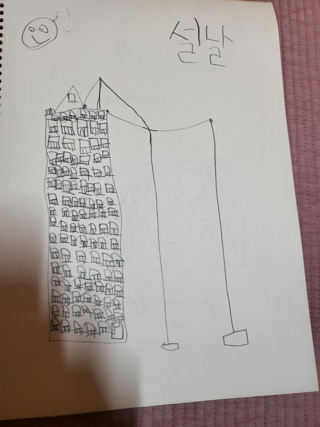 나는 산골을 풍경으로 그리고, 아이는 낡은 아파트를 그린다. 근데 나는 그림 실력도 안 되지만 뒷산, 집, 해 순으로 대충 그리는 데 아이는 아니다. 높이가 10층 이상 되는 아파트를 정성스레 그린다. 게다가 난간도 빠질세라 집마다 하나하나. 곁에서 지켜보는 데 아이가 솔직히 '존경스럽다.' 호랑이 털을 하나하나 그려 넣던 옛날 화가들 모습이 겹쳐 보인다. 아이는 이어서 전봇대 둘. 뒷산. 해를 마저 그렸다. '설날'이란 단어는 잘 모르니까 내가 알려주면 그제야 그림 한편에 써넣는다.
