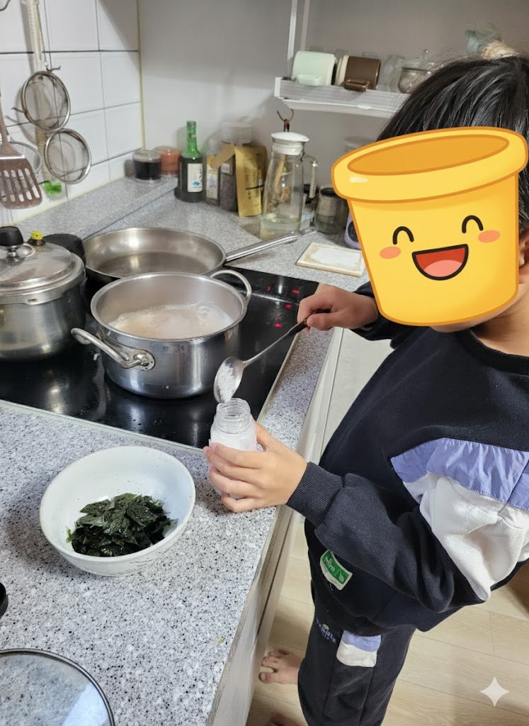 이어서 달걀을 푼다. 이것도 처음 해보는 아이한테 쉬운 일은 아니다. 달걀을 깨뜨리는 것부터 어렵다. 냄비 모서리에 달걀을 부딪쳐 금이 갔지만 잘 안 나온다. 두 손으로 힘을 주자, 안에 내용물이 조금 냄비 밖으로 튄다.