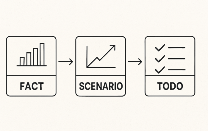 오늘부터 한 번씩 이 3단계를 의식적으로 적용해 보자. 감이 아니라 팩트로, 추측이 아니라 시나리오로, 막연함이 아니라 Todo로.