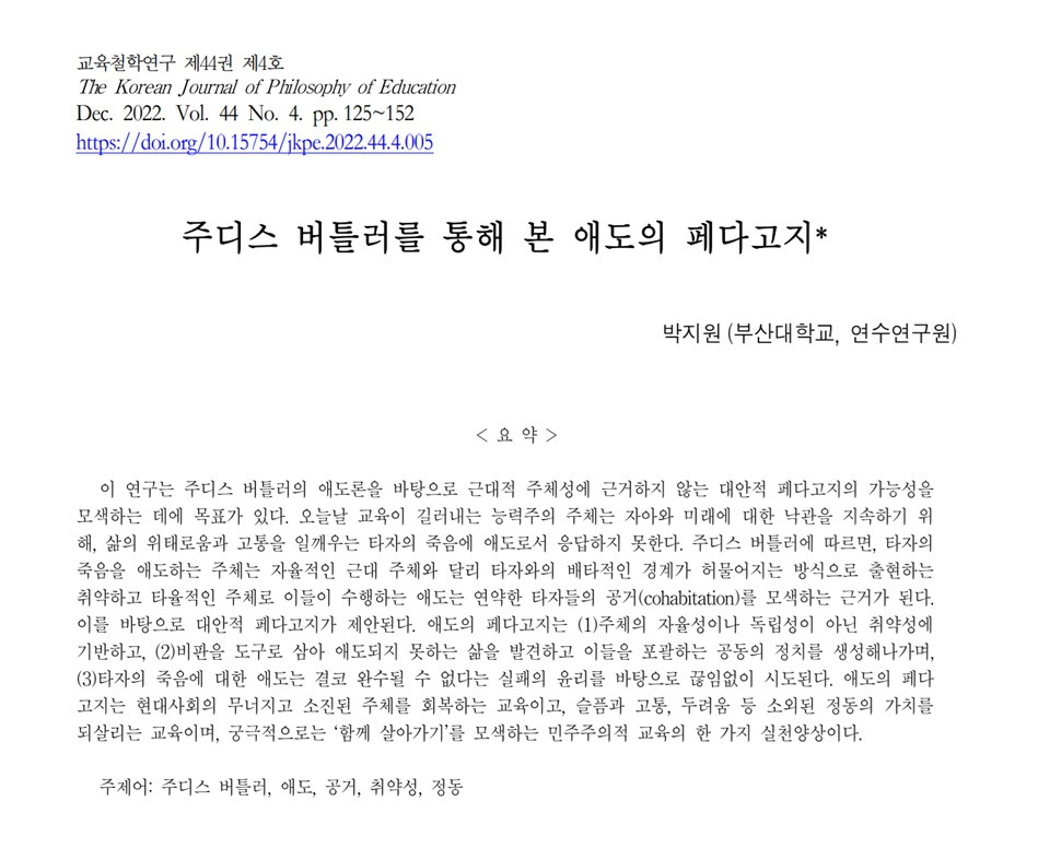 버틀러의 설명은 어린 시절 짝꿍의 추억과 연결점이 있습니다. 초등학생 시절에도 짝꿍은 제가 임의대로 선택할 수 있는 대상이 아니었습니다. 많은 초등학교 선생님들이 제비를 뽑아서 짝꿍을 정했던 것으로 기억합니다. 아이들에게 짝꿍은 자신이 선택할 수 있는 대상이 아닙니다. 각자는 서로 자신이 앉을 자리 만을 선택할 수 있습니다. 그리고 반 아이들은 서로 짝꿍이 되어 싫어하고 미워하면서도 시간이 지나면 상대와 잘 지내는 방법을 터득하기 시작합니다. 때때로 사이가 너무 틀어져 선생님께 달려가 자리를 바꾸는 경우도 있었습니다. 하지만 대부분의 경우에는 서로가 조금씩 양보하고 어울려 지내는 길을 택했습니다. 바로 버틀러가 말하는 것처럼 우리에게 타자는 대적하고 혐오해야 할 대상이기 보다는 배려와 소통으로 관계해야 할 대상인 것입니다.