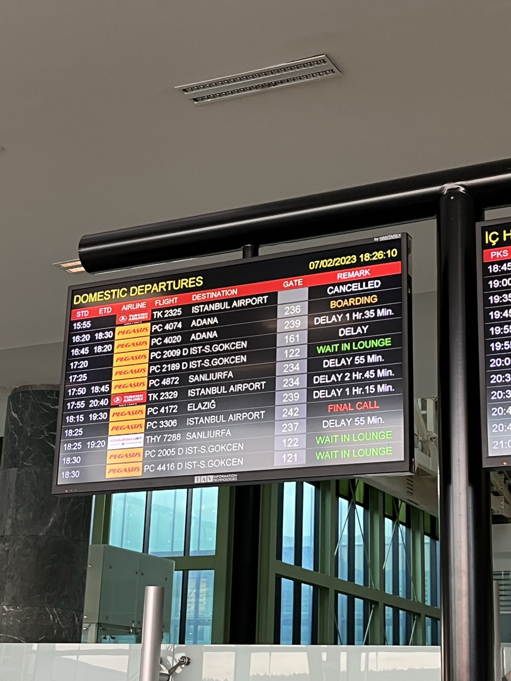2차 지연 후 대망의 오후 7시. 이젠 우리의 시선은 모두 전광판으로 향해있다. 슬슬 출발 시간이 가까워지니 이번에도 전광판에 우리 비행기 편 시간이 사라졌다. 이번엔 얼마나 미룰까, 이젠 더 이상의 기대도 하지 않았다. 하지만 이들은 전혀 생각지도 못한 새로운 경우의 수를 우리에게 제시했다. CANCELLED. 이제 와서 결항이라고 한다. 왜 이제야 이런 결정을 내린 걸까, 전혀 이해가 되지는 않았지만 뭐 어쩌겠나, 이곳은 튀르키예다.