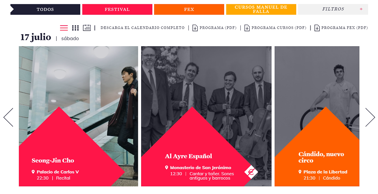 페스티벌은 알함브라 궁 안에서 개최되는 메인 프로그램 외에 그라나다 도시 내 길거리에서 개최되는 FEX(EXtension del Festival)가 있다. 2014년 국립현대무용단이 작품 <혼합>으로 초청된 적이 있다.