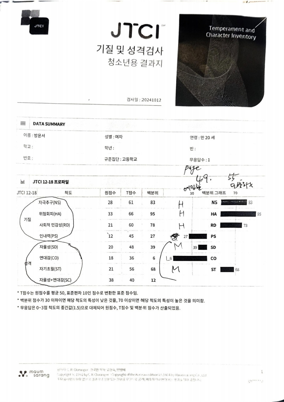 오늘은 마지막 상담 일자였다. 선생님께 나의 신간 에세이를 드리고 나 또한 마지막 선물을 받았다. 청소년 상담 복지센터에서는 기관에서 제공하는 선물을 내담자들에게 많이 나누어 준다. 오늘은 마지막 상담 날이자 나의 성격 검사지 결과가 나오는 날이다. JTCI란, 청소년 성격 및 기질 검사로, 타고난 기질, 형성된 성격구조, 성격 발달의 성숙도를 포괄적으로 평가할 수 있는 도구이다. 나는 검사지를 보며 이 생각이 가장 먼저 떠올랐다.