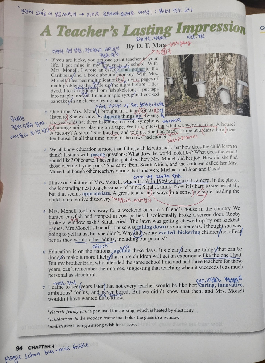 'AI 활용영어'라는 강의를 듣던 중, 내 이목을 끄는 본문하나를 발견했다. 출처 : Longman Academic Reading Series - A Teacher's Lasting Impression. 여기 나오는 선생님 Mrs. Monell 은 아이들에게 창의적이고 비전통적인 활동을 중심으로 다양한 수업을 경험하게 해 주신다. 아이들의 호기심을 이끌어내기 위한 방법도 고안하고 아이들이 사고를 쳐도 혼내고 다그치지 않는다. 엄청난 평정심을 유지하는 이 선생님은 본문에서 묘사된 것과 같이 나에게는 고수처럼 느껴졌다. 교육계에 종사할 생각은 없다. 다만 과외를 하기 시작하면 이미 발을 담근 거나 다름없으려나. 이 본문을 읽으며 교수님의 추가 설명을 들으니 내가 항상 고민하던 점이 다시 수면 위로 떠오르는 듯했다. '좋은 선생님이란 어떤 선생님인가.'